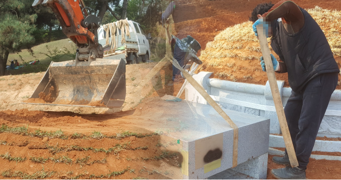 성분(봉분을 만드는 것)을 진행하고, 계약내용 대로 고객님의 요청사항이 있을 때 둘레석, 상석, 비석 등 석물(石物)을 설치하기도 합니다.