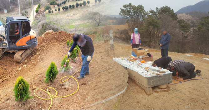 식재할 수목이 있다면 식재하고, 주변에 잔디를 꼼꼼히 식재하여 선영을 정돈합니다. 또한 공사 완료 전 고객님의 요청사항이나 피드백을 받아 수정사항이 있다면 수정 합니다. 고객님의 요청사항이 잘 반영되어 공사가 마무리 되면, 필요시 성분제(成墳祭)를 올리고 마무리 합니다.